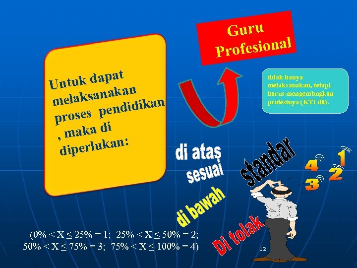 Guru esional Prof k dapat Untu nakan melaksa didikan n oses pe pr aka di , m : erlukan dip (0% < X ≤ 25% = 1; 25% < X ≤ 50% = 2; 50% < X ≤ 75% = 3; 75% < X ≤ 100% = 4) tidak hanya melaksanakan, tetapi harus mengembngkan profesinya (KTI dll). 12