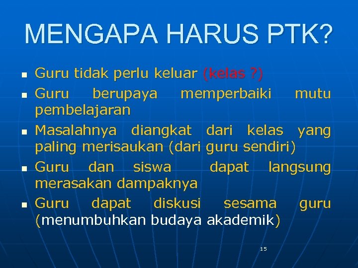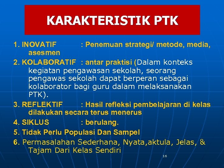 MENGAPA HARUS PTK? n n n Guru tidak perlu keluar (kelas ? ) Guru berupaya memperbaiki mutu pembelajaran Masalahnya diangkat dari kelas yang paling merisaukan (dari guru sendiri) Guru dan siswa dapat langsung merasakan dampaknya Guru dapat diskusi sesama guru (menumbuhkan budaya akademik) 15