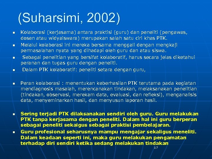 (Suharsimi, 2002) n n n n Kolaborasi (kerjasama) antara praktisi (guru) dan peneliti ( pengawas, dosen atau widyaiswara) merupakan salah satu ciri khas PTK. Melalui kolaborasi ini mereka bersama menggali dengan mengkaji permasalahan nyata yang dihadapi oleh guru dan atau siswa. Sebagai penelitian yang bersifat kolaboratif, harus secara jelas diketahui peranan dan tugas guru dengan peneliti. Dalam PTK kolaboratif: peneliti setara dengan guru, Peran kolaborasi : menentukan keberhasilan PTK terutama pada kegiatan mendiagnosis masalah, merencanakan tindakan, melaksanakan penelitian (tindakan, observasi, merekam data, evaluasi, dan refleksi), menganalisis data, menyeminarkan hasil, dan menyusun laporan hasil. Sering terjadi PTK dilaksanakan sendiri oleh guru. Guru melakukan PTK tanpa kerjasama dengan peneliti. Dalam hal ini guru berperan sebagai peneliti sekaigus sebagai praktisi pembelajaran. Guru profesional seharusnya mampu mengajar sekaligus meneliti. Dalam keadaan seperti ini, maka guru melakukan pengamatan terhadap diri sendiri ketika sedang melakukan tindakan 17