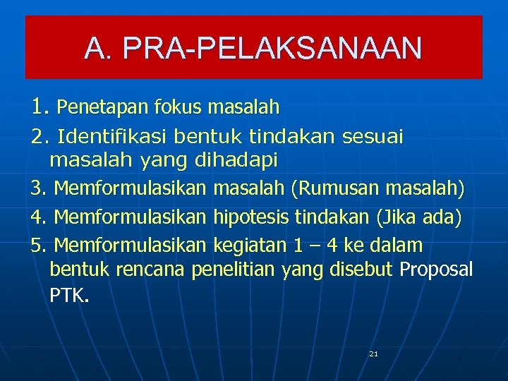 A. PRA-PELAKSANAAN 1. Penetapan fokus masalah 2. Identifikasi bentuk tindakan sesuai masalah yang dihadapi 3. Memformulasikan masalah (Rumusan masalah) 4. Memformulasikan hipotesis tindakan (Jika ada) 5. Memformulasikan kegiatan 1 – 4 ke dalam bentuk rencana penelitian yang disebut Proposal PTK. 21