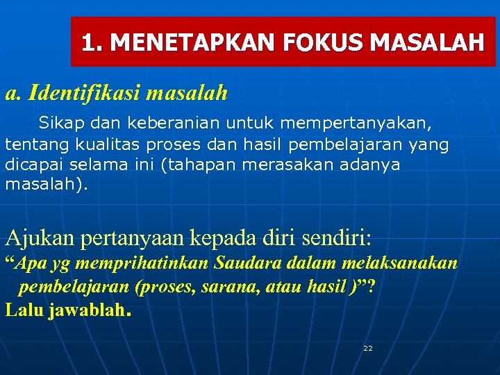 1. MENETAPKAN FOKUS MASALAH a. Identifikasi masalah Sikap dan keberanian untuk mempertanyakan, tentang kualitas proses dan hasil pembelajaran yang dicapai selama ini (tahapan merasakan adanya masalah). Ajukan pertanyaan kepada diri sendiri: “Apa yg memprihatinkan Saudara dalam melaksanakan pembelajaran (proses, sarana, atau hasil )”? Lalu jawablah. 22