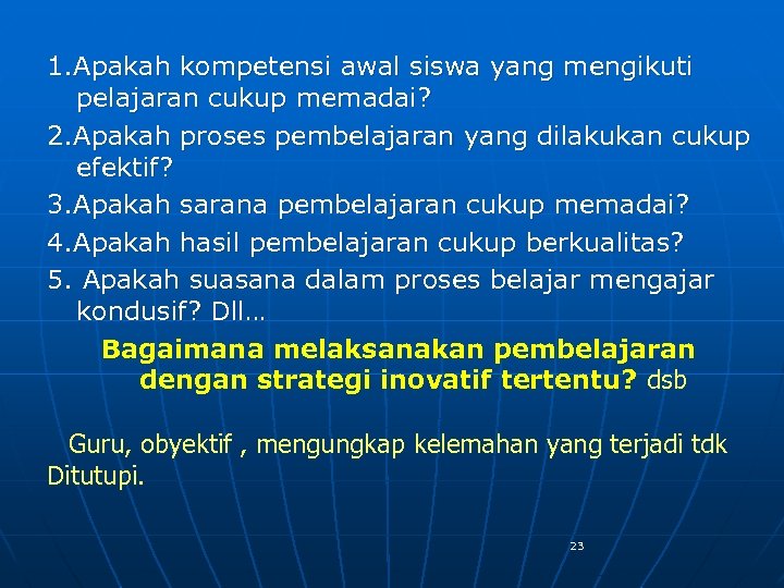 1. Apakah kompetensi awal siswa yang mengikuti pelajaran cukup memadai? 2. Apakah proses pembelajaran yang dilakukan cukup efektif? 3. Apakah sarana pembelajaran cukup memadai? 4. Apakah hasil pembelajaran cukup berkualitas? 5. Apakah suasana dalam proses belajar mengajar kondusif? Dll… Bagaimana melaksanakan pembelajaran dengan strategi inovatif tertentu? dsb Guru, obyektif , mengungkap kelemahan yang terjadi tdk Ditutupi. 23