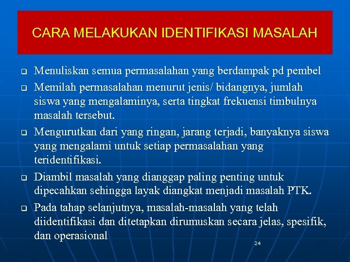 CARA MELAKUKAN IDENTIFIKASI MASALAH q q q Menuliskan semua permasalahan yang berdampak pd pembel Memilah permasalahan menurut jenis/ bidangnya, jumlah siswa yang mengalaminya, serta tingkat frekuensi timbulnya masalah tersebut. Mengurutkan dari yang ringan, jarang terjadi, banyaknya siswa yang mengalami untuk setiap permasalahan yang teridentifikasi. Diambil masalah yang dianggap paling penting untuk dipecahkan sehingga layak diangkat menjadi masalah PTK. Pada tahap selanjutnya, masalah-masalah yang telah diidentifikasi dan ditetapkan dirumuskan secara jelas, spesifik, dan operasional 24