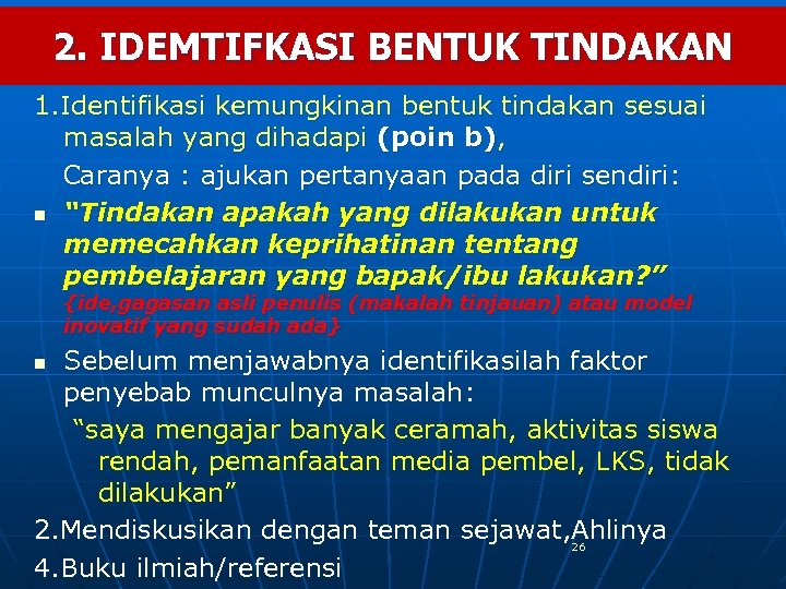 b. Menetapkan masalah 1. Aktifitas dan hasil belajar siswa rendah 2. Rendahnya kemampuan siswa dalam menulis 3. Rendah Partisipasi siswa dalam kegiatan pembelajaran 4. Rendahnya pemahaman siswa terhadap materi pelajaran ? 5. dll (V. Harapan) 25