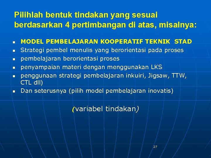 2. IDEMTIFKASI BENTUK TINDAKAN 1. Identifikasi kemungkinan bentuk tindakan sesuai masalah yang dihadapi (poin b), Caranya : ajukan pertanyaan pada diri sendiri: n “Tindakan apakah yang dilakukan untuk memecahkan keprihatinan tentang pembelajaran yang bapak/ibu lakukan? ” {ide, gagasan asli penulis (makalah tinjauan) atau model inovatif yang sudah ada} Sebelum menjawabnya identifikasilah faktor penyebab munculnya masalah: “saya mengajar banyak ceramah, aktivitas siswa rendah, pemanfaatan media pembel, LKS, tidak dilakukan” 2. Mendiskusikan dengan teman sejawat, Ahlinya 26 4. Buku ilmiah/referensi n