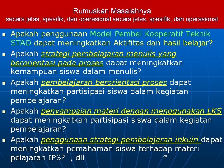 Rumuskan Masalahnya secara jelas, spesifik, dan operasional n n n Apakah penggunaan Model Pembel Kooperatif Teknik STAD dapat meningkatkan Aktifitas dan hasil belajar? Apakah strategi pembelajaran menulis yang berorientasi pada proses dapat meningkatkan kemampuan siswa dalam menulis? Apakah pembelajaran berorientasi proses dapat meningkatkan partisipasi siswa dalam kegiatan pembelajaran? Apakah penyampaian materi dengan menggunakan LKS dapat meningkatkan partisipasi siswa dalam kegiatan pembelajaran? Apakah penggunaan strategi pembelajaran inkuiri dapat meningkatkan pemahaman siswa terhadap materi 28 pelajaran IPS? , dll