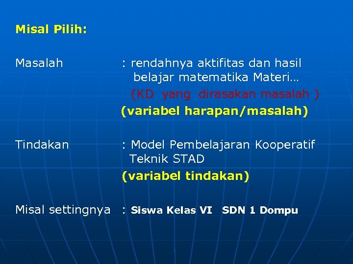 Misal Pilih: Masalah : rendahnya aktifitas dan hasil belajar matematika Materi… (KD yang dirasakan masalah ) (variabel harapan/masalah) Tindakan : Model Pembelajaran Kooperatif Teknik STAD (variabel tindakan) Misal settingnya : Siswa Kelas VI SDN 1 Dompu