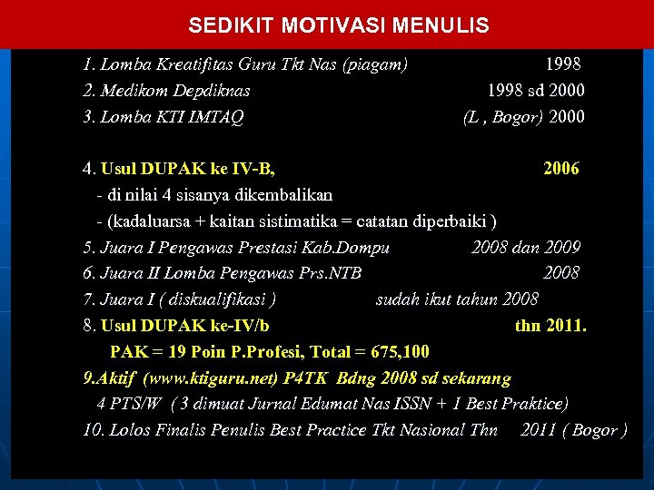 SEDIKIT MOTIVASI MENULIS 1. Lomba Kreatifitas Guru Tkt Nas (piagam) 1998 2. Medikom Depdiknas 1998 sd 2000 3. Lomba KTI IMTAQ (L , Bogor) 2000 4. Usul DUPAK ke IV-B, 2006 - di nilai 4 sisanya dikembalikan - (kadaluarsa + kaitan sistimatika = catatan diperbaiki ) 5. Juara I Pengawas Prestasi Kab. Dompu 2008 dan 2009 6. Juara II Lomba Pengawas Prs. NTB 2008 7. Juara I ( diskualifikasi ) sudah ikut tahun 2008 8. Usul DUPAK ke-IV/b thn 2011. PAK = 19 Poin P. Profesi, Total = 675, 100 9. Aktif (www. ktiguru. net) P 4 TK Bdng 2008 sd sekarang 4 PTS/W ( 3 dimuat Jurnal Edumat Nas ISSN + 1 Best Praktice) 10. Lolos Finalis Penulis Best Practice Tkt Nasional Thn 2011 ( Bogor )