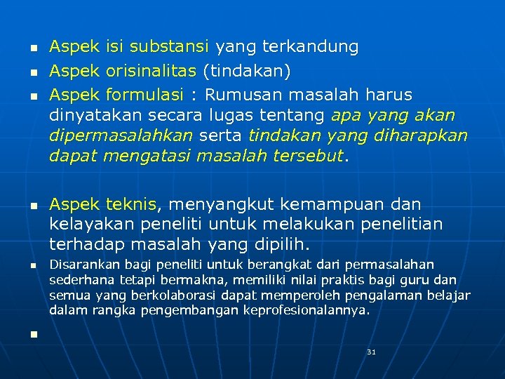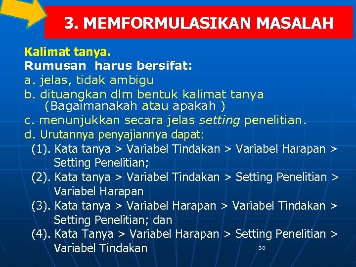 3. MEMFORMULASIKAN MASALAH Kalimat tanya. Rumusan harus bersifat: a. jelas, tidak ambigu b. dituangkan dlm bentuk kalimat tanya (Bagaimanakah atau apakah ) c. menunjukkan secara jelas setting penelitian. d. Urutannya penyajiannya dapat: (1). Kata tanya > Variabel Tindakan > Variabel Harapan > Setting Penelitian; (2). Kata tanya > Variabel Tindakan > Setting Penelitian > Variabel Harapan (3). Kata tanya > Variabel Harapan > Variabel Tindakan > Setting Penelitian; dan (4). Kata Tanya > Variabel Harapan > Setting Penelitian > 30 Variabel Tindakan