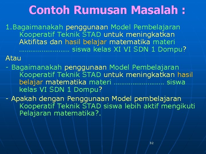 Contoh Rumusan Masalah : 1. Bagaimanakah penggunaan Model Pembelajaran Kooperatif Teknik STAD untuk meningkatkan Aktifitas dan hasil belajar matematika materi …………… siswa kelas XI VI SDN 1 Dompu? Atau - Bagaimanakah penggunaan Model Pembelajaran Kooperatif Teknik STAD untuk meningkatkan hasil belajar matematika materi …………… siswa kelas VI SDN 1 Dompu? - Apakah dengan Penggunaan Model pembelajaran Kooperatif Teknik STAD siswa lebih aktif mengikuti Pelajaran matematika? . 32