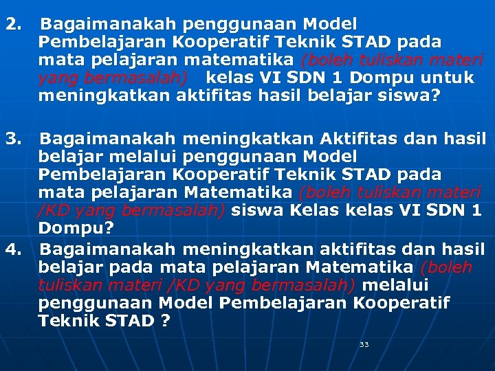 2. Bagaimanakah penggunaan Model Pembelajaran Kooperatif Teknik STAD pada mata pelajaran matematika (boleh tuliskan materi yang bermasalah) kelas VI SDN 1 Dompu untuk meningkatkan aktifitas hasil belajar siswa? 3. Bagaimanakah meningkatkan Aktifitas dan hasil belajar melalui penggunaan Model Pembelajaran Kooperatif Teknik STAD pada mata pelajaran Matematika (boleh tuliskan materi /KD yang bermasalah) siswa Kelas kelas VI SDN 1 Dompu? 4. Bagaimanakah meningkatkan aktifitas dan hasil belajar pada mata pelajaran Matematika (boleh tuliskan materi /KD yang bermasalah) melalui penggunaan Model Pembelajaran Kooperatif Teknik STAD ? 33