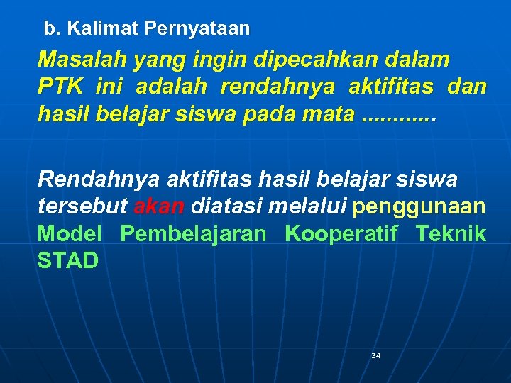 b. Kalimat Pernyataan Masalah yang ingin dipecahkan dalam PTK ini adalah rendahnya aktifitas dan hasil belajar siswa pada mata. . . Rendahnya aktifitas hasil belajar siswa tersebut akan diatasi melalui penggunaan Model Pembelajaran Kooperatif Teknik STAD 34