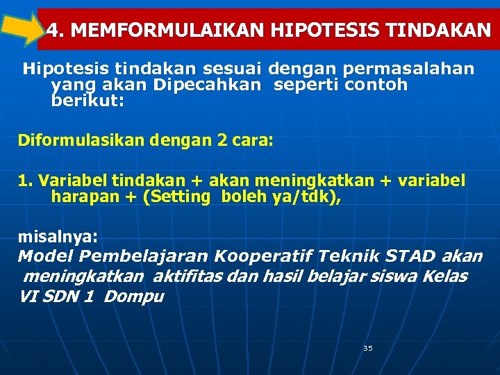 4. MEMFORMULAIKAN HIPOTESIS TINDAKAN Hipotesis tindakan sesuai dengan permasalahan yang akan Dipecahkan seperti contoh berikut: Diformulasikan dengan 2 cara: 1. Variabel tindakan + akan meningkatkan + variabel harapan + (Setting boleh ya/tdk), misalnya: Model Pembelajaran Kooperatif Teknik STAD akan meningkatkan aktifitas dan hasil belajar siswa Kelas VI SDN 1 Dompu 35