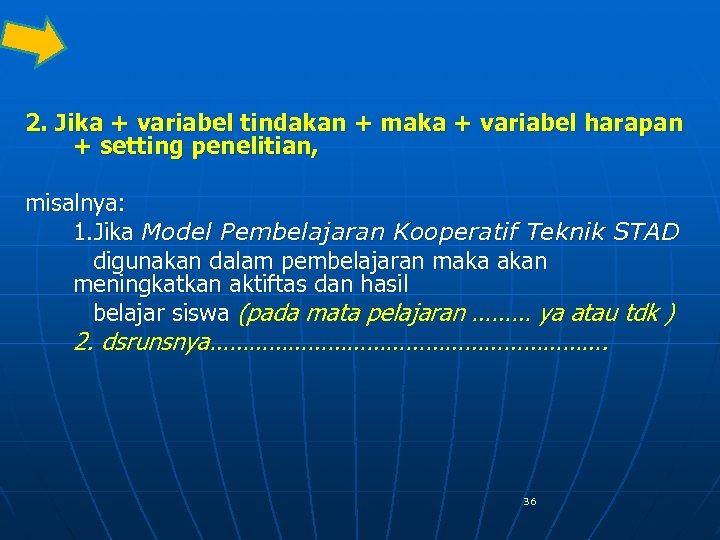 2. Jika + variabel tindakan + maka + variabel harapan + setting penelitian, misalnya: 1. Jika Model Pembelajaran Kooperatif Teknik STAD digunakan dalam pembelajaran maka akan meningkatkan aktiftas dan hasil belajar siswa (pada mata pelajaran ……… ya atau tdk ) 2. dsrunsnya…………………………. 36