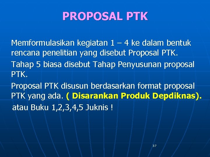 PROPOSAL PTK Memformulasikan kegiatan 1 – 4 ke dalam bentuk rencana penelitian yang disebut Proposal PTK. Tahap 5 biasa disebut Tahap Penyusunan proposal PTK. Proposal PTK disusun berdasarkan format proposal PTK yang ada. ( Disarankan Produk Depdiknas). atau Buku 1, 2, 3, 4, 5 Juknis ! 37