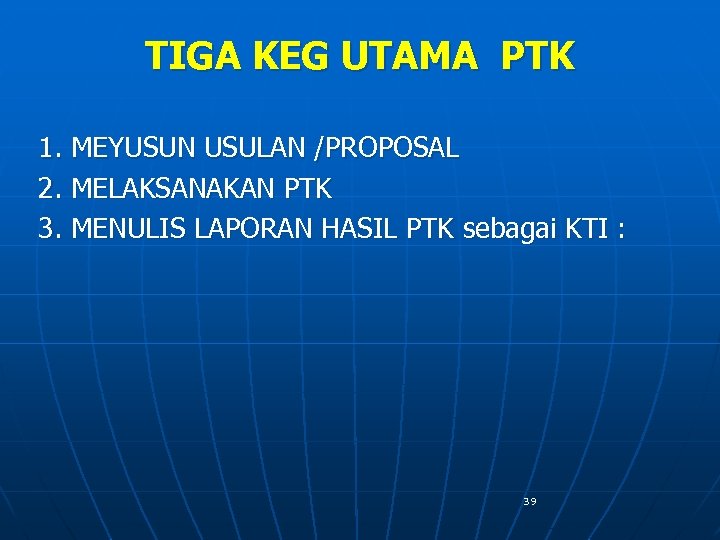 TIGA KEG UTAMA PTK 1. MEYUSUN USULAN /PROPOSAL 2. MELAKSANAKAN PTK 3. MENULIS LAPORAN HASIL PTK sebagai KTI : 39