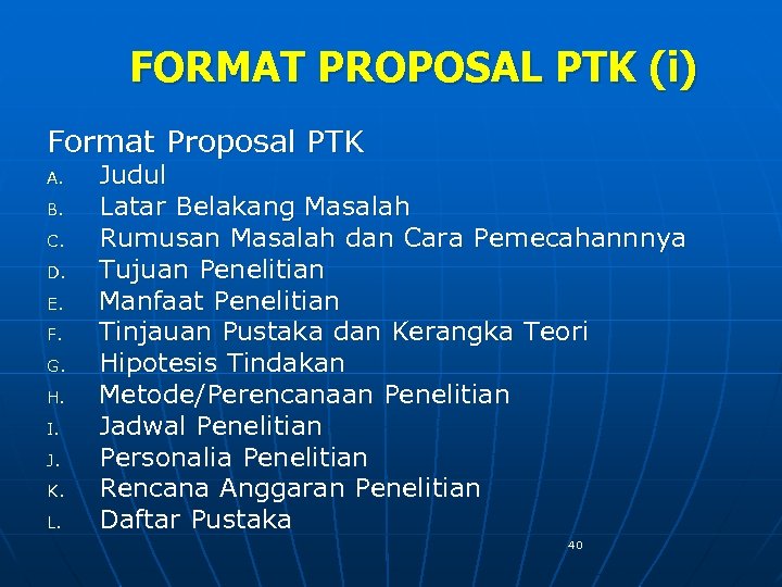 FORMAT PROPOSAL PTK (i) Format Proposal PTK A. B. C. D. E. F. G. H. I. J. K. L. Judul Latar Belakang Masalah Rumusan Masalah dan Cara Pemecahannnya Tujuan Penelitian Manfaat Penelitian Tinjauan Pustaka dan Kerangka Teori Hipotesis Tindakan Metode/Perencanaan Penelitian Jadwal Penelitian Personalia Penelitian Rencana Anggaran Penelitian Daftar Pustaka 40