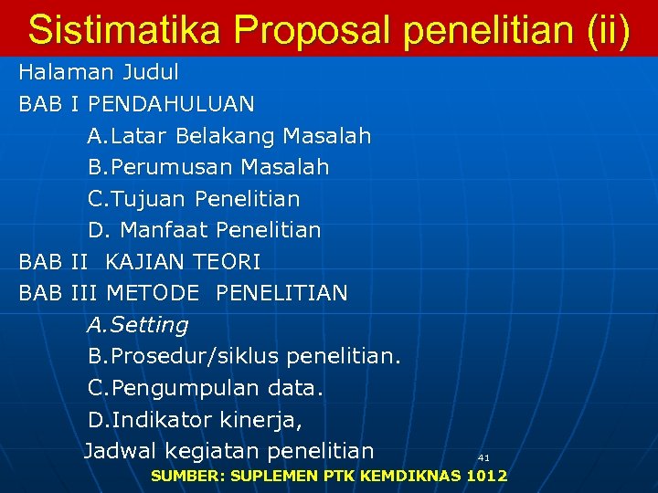 Sistimatika Proposal penelitian (ii) Halaman Judul BAB I PENDAHULUAN A. Latar Belakang Masalah B. Perumusan Masalah C. Tujuan Penelitian D. Manfaat Penelitian BAB II KAJIAN TEORI BAB III METODE PENELITIAN A. Setting B. Prosedur/siklus penelitian. C. Pengumpulan data. D. Indikator kinerja, Jadwal kegiatan penelitian 41 SUMBER: SUPLEMEN PTK KEMDIKNAS 1012