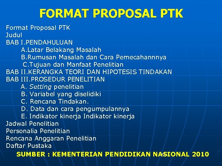 FORMAT PROPOSAL PTK Format Proposal PTK Judul BAB I. PENDAHULUAN A. Latar Belakang Masalah B. Rumusan Masalah dan Cara Pemecahannnya C. Tujuan dan Manfaat Penelitian BAB II. KERANGKA TEORI DAN HIPOTESIS TINDAKAN BAB III. PROSEDUR PENELITIAN A. Setting penelitian B. Variabel yang diselidiki C. Rencana Tindakan. D. Data dan cara pengumpulannya E. Indikator kinerja Jadwal Penelitian Personalia Penelitian Rencana Anggaran Penelitian Daftar Pustaka 42 SUMBER : KEMENTERIAN PENDIDIKAN NASIONAL 2010