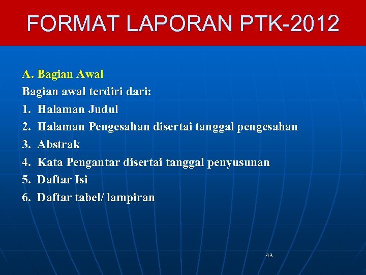 FORMAT LAPORAN PTK-2012 A. Bagian Awal Bagian awal terdiri dari: 1. Halaman Judul 2. Halaman Pengesahan disertai tanggal pengesahan 3. Abstrak 4. Kata Pengantar disertai tanggal penyusunan 5. Daftar Isi 6. Daftar tabel/ lampiran 43