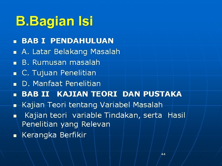 B. Bagian Isi n n n n n BAB I PENDAHULUAN A. Latar Belakang Masalah B. Rumusan masalah C. Tujuan Penelitian D. Manfaat Penelitian BAB II KAJIAN TEORI DAN PUSTAKA Kajian Teori tentang Variabel Masalah Kajian teori variable Tindakan, serta Hasil Penelitian yang Relevan Kerangka Berfikir 44