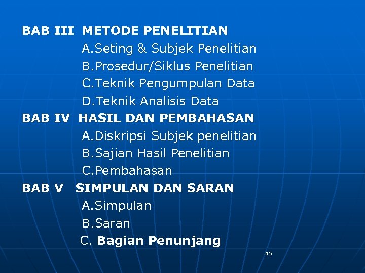 BAB III METODE PENELITIAN A. Seting & Subjek Penelitian B. Prosedur/Siklus Penelitian C. Teknik Pengumpulan Data D. Teknik Analisis Data BAB IV HASIL DAN PEMBAHASAN A. Diskripsi Subjek penelitian B. Sajian Hasil Penelitian C. Pembahasan BAB V SIMPULAN DAN SARAN A. Simpulan B. Saran C. Bagian Penunjang 45
