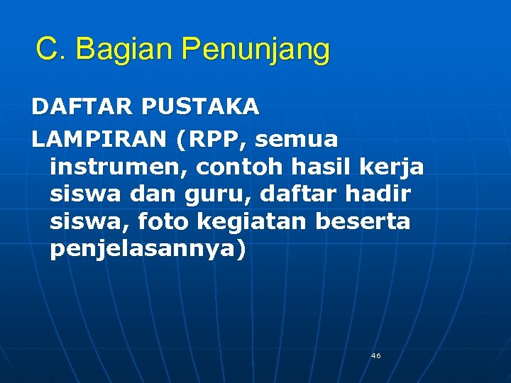 C. Bagian Penunjang DAFTAR PUSTAKA LAMPIRAN (RPP, semua instrumen, contoh hasil kerja siswa dan guru, daftar hadir siswa, foto kegiatan beserta penjelasannya) 46
