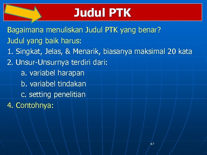 Judul PTK Bagaimana menuliskan Judul PTK yang benar? Judul yang baik harus: 1. Singkat, Jelas, & Menarik, biasanya maksimal 20 kata 2. Unsur-Unsurnya terdiri dari: a. variabel harapan b. variabel tindakan c. setting penelitian 4. Contohnya: 47