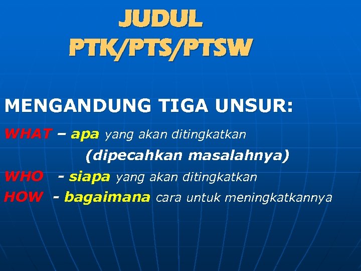 JUDUL PTK/PTSW MENGANDUNG TIGA UNSUR: WHAT – apa yang akan ditingkatkan (dipecahkan masalahnya) WHO - siapa yang akan ditingkatkan HOW - bagaimana cara untuk meningkatkannya