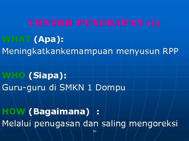 CONTOH PENERAPAN (1) WHAT (Apa): Meningkatkankemampuan menyusun RPP WHO (Siapa): Guru-guru di SMKN 1 Dompu HOW (Bagaimana) : Melalui penugasan dan saling mengoreksi 50