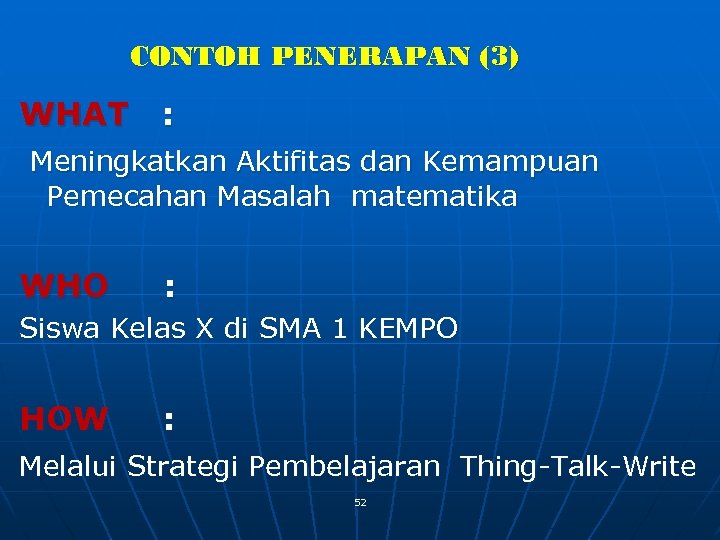 CONTOH PENERAPAN (3) WHAT : Meningkatkan Aktifitas dan Kemampuan Pemecahan Masalah matematika WHO : Siswa Kelas X di SMA 1 KEMPO HOW : Melalui Strategi Pembelajaran Thing-Talk-Write 52