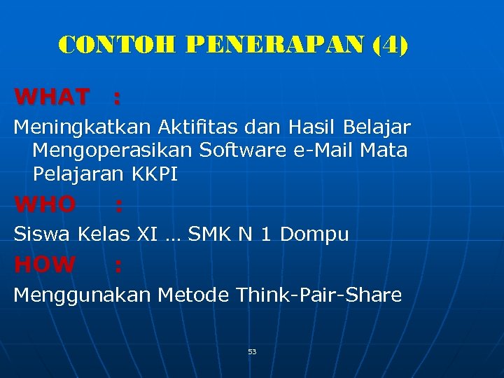 CONTOH PENERAPAN (4) WHAT : Meningkatkan Aktifitas dan Hasil Belajar Mengoperasikan Software e-Mail Mata Pelajaran KKPI WHO : Siswa Kelas XI … SMK N 1 Dompu HOW : Menggunakan Metode Think-Pair-Share 53