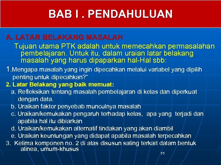 BAB I. PENDAHULUAN A. LATAR BELAKANG MASALAH Tujuan utama PTK adalah untuk memecahkan permasalahan pembelajaran. Untuk itu, dalam uraian latar belakang masalah yang harus dipaparkan hal-Hal sbb: 1. Mengapa masalah yang ingin dipecahkan melalui variabel yang dipilih penting untuk dipecahkan? ” 2. Latar Belakang yang baik memuat: a. Refleksikan tentang masalah pembelajaran di kelas dan diperkuat dengan data. b. Uraikan faktor penyebab munculnya masalah c. Uraikan/kemukakan pengaruh terhadap kelas, apa yang terjadi dan apabila hal itu dibiarkan d. Uraikan/kemukakan alternatif tindakan yang akan diambil e. Uraikan keuntungan yang didapat apabila masalah terpecahkan 3. Kelima komponen no. 2 di atas disusun saling terkait dalam bentuk alinea, umum-khusus 55