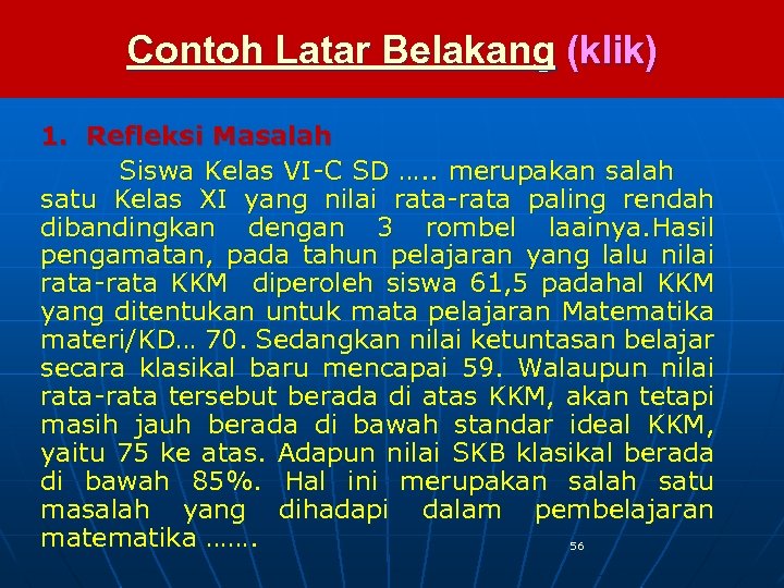 Contoh Latar Belakang (klik) 1. Refleksi Masalah Siswa Kelas VI-C SD …. . merupakan salah satu Kelas XI yang nilai rata-rata paling rendah dibandingkan dengan 3 rombel laainya. Hasil pengamatan, pada tahun pelajaran yang lalu nilai rata-rata KKM diperoleh siswa 61, 5 padahal KKM yang ditentukan untuk mata pelajaran Matematika materi/KD… 70. Sedangkan nilai ketuntasan belajar secara klasikal baru mencapai 59. Walaupun nilai rata-rata tersebut berada di atas KKM, akan tetapi masih jauh berada di bawah standar ideal KKM, yaitu 75 ke atas. Adapun nilai SKB klasikal berada di bawah 85%. Hal ini merupakan salah satu masalah yang dihadapi dalam pembelajaran matematika ……. 56