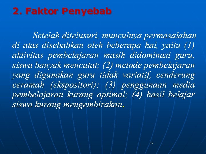 2. Faktor Penyebab Setelah ditelusuri, munculnya permasalahan di atas disebabkan oleh beberapa hal, yaitu (1) aktivitas pembelajaran masih didominasi guru, siswa banyak mencatat; (2) metode pembelajaran yang digunakan guru tidak variatif, cenderung ceramah (ekspositori); (3) penggunaan media pembelajaran kurang optimal; (4) hasil belajar siswa kurang mengembirakan. 57