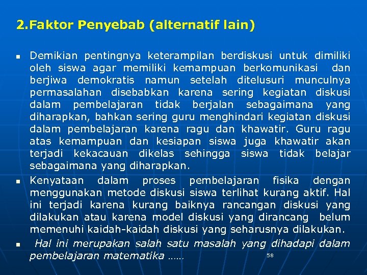 2. Faktor Penyebab (alternatif lain) n n n Demikian pentingnya keterampilan berdiskusi untuk dimiliki oleh siswa agar memiliki kemampuan berkomunikasi dan berjiwa demokratis namun setelah ditelusuri munculnya permasalahan disebabkan karena sering kegiatan diskusi dalam pembelajaran tidak berjalan sebagaimana yang diharapkan, bahkan sering guru menghindari kegiatan diskusi dalam pembelajaran karena ragu dan khawatir. Guru ragu atas kemampuan dan kesiapan siswa juga khawatir akan terjadi kekacauan dikelas sehingga siswa tidak belajar sebagaimana yang diharapkan. Kenyataan dalam proses pembelajaran fisika dengan menggunakan metode diskusi siswa terlihat kurang aktif. Hal ini terjadi karena kurang baiknya rancangan diskusi yang dilakukan atau karena model diskusi yang dirancang belum memenuhi kaidah-kaidah diskusi yang seharusnya dilakukan. Hal ini merupakan salah satu masalah yang dihadapi dalam 58 pembelajaran matematika ……