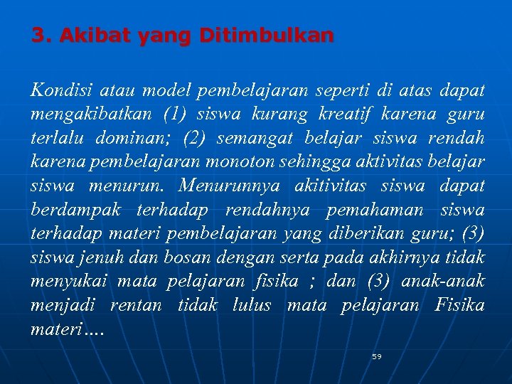3. Akibat yang Ditimbulkan Kondisi atau model pembelajaran seperti di atas dapat mengakibatkan (1) siswa kurang kreatif karena guru terlalu dominan; (2) semangat belajar siswa rendah karena pembelajaran monoton sehingga aktivitas belajar siswa menurun. Menurunnya akitivitas siswa dapat berdampak terhadap rendahnya pemahaman siswa terhadap materi pembelajaran yang diberikan guru; (3) siswa jenuh dan bosan dengan serta pada akhirnya tidak menyukai mata pelajaran fisika ; dan (3) anak-anak menjadi rentan tidak lulus mata pelajaran Fisika materi…. 59