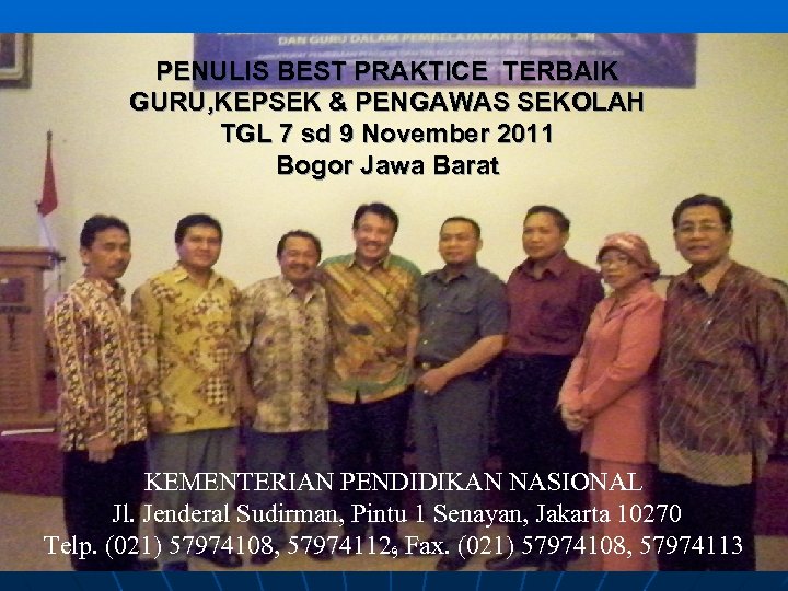 PENULIS BEST PRAKTICE TERBAIK GURU, KEPSEK & PENGAWAS SEKOLAH TGL 7 sd 9 November 2011 Bogor Jawa Barat KEMENTERIAN PENDIDIKAN NASIONAL Jl. Jenderal Sudirman, Pintu 1 Senayan, Jakarta 10270 6 Telp. (021) 57974108, 57974112, Fax. (021) 57974108, 57974113