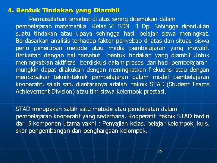 4. Bentuk Tindakan yang Diambil Permasalahan tersebut di atas sering ditemukan dalam pembelajaran matematika Kelas VI SDN 1 Dp. Sehingga diperlukan suatu tindakan atau upaya sehingga hasil belajar siswa meningkat. Berdasarkan analisis terhadap faktor penyebab di atas dan situasi siswa perlu penerapan metode atau media pembelajaran yang inovatif. Berkaitan dengan hal tersebut bentuk tindakan yang diambil Untuk meningkatkan aktifitas berdiskusi dalam proses dan hasil pembelajaran mungkin dapat dilakukan dengan meningkatkan frekuensi atau dengan mencobakan teknik-teknik pembelajaran dalam model pembelajaran kooperatif, salah satu diantaranya adalah teknik STAD (Student Teams Achievement Division) atau tim siswa kelompok prestasi. STAD merupakan salah satu metode atau pendekatan dalam pembelajaran kooperatif yang sederhana. Kooperatif teknik STAD terdiri dari 5 komponen utama yakni : Penyajian kelas, belajar kelompok, kuis, skor pengembangan dan penghargaan kelompok. 60