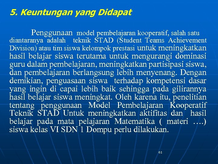 5. Keuntungan yang Didapat Penggunaan model pembelajaran kooperatif, salah satu diantaranya adalah teknik STAD (Student Teams Achievement Division) atau tim siswa kelompok prestasi untuk meningkatkan hasil belajar siswa terutama untuk mengurangi dominasi guru dalam pembelajaran, meningkatkan partisipasi siswa, dan pembelajaran berlangsung lebih menyenang. Dengan demikian, penguasaan siswa terhadap kompetensi dasar yang ingin di capai lebih baik sehingga pada gilirannya hasil belajar siswa meningkat. Oleh karena itu, penelitian tentang penggunaan Model Pembelajaran Kooperatif Teknik STAD Untuk meningkatkan aktifitas dan hasil belajar pada mata pelajaran Matematika ( materi …. ) siswa kelas VI SDN 1 Dompu perlu dilakukan. 61