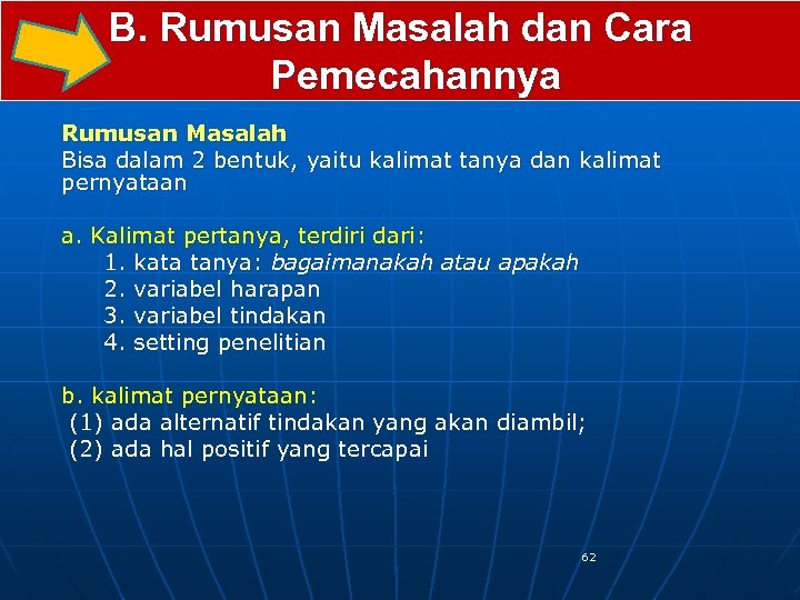 B. Rumusan Masalah dan Cara Pemecahannya Rumusan Masalah Bisa dalam 2 bentuk, yaitu kalimat tanya dan kalimat pernyataan a. Kalimat pertanya, terdiri dari: 1. kata tanya: bagaimanakah atau apakah 2. variabel harapan 3. variabel tindakan 4. setting penelitian b. kalimat pernyataan: (1) ada alternatif tindakan yang akan diambil; (2) ada hal positif yang tercapai 62