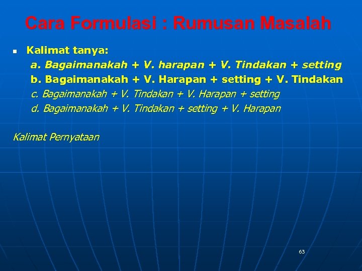 Cara Formulasi : Rumusan Masalah n Kalimat tanya: a. Bagaimanakah + V. harapan + V. Tindakan + setting b. Bagaimanakah + V. Harapan + setting + V. Tindakan c. Bagaimanakah + V. Tindakan + V. Harapan + setting d. Bagaimanakah + V. Tindakan + setting + V. Harapan Kalimat Pernyataan 63