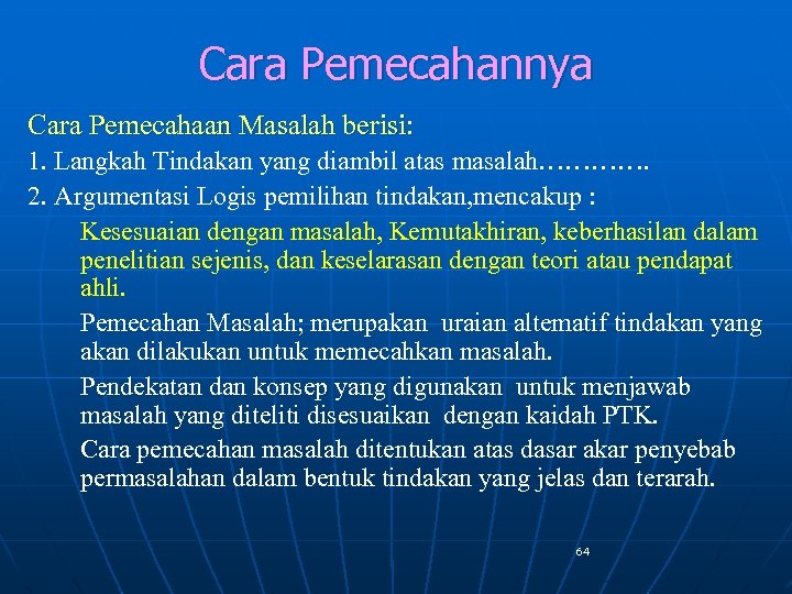 Cara Pemecahannya Cara Pemecahaan Masalah berisi: 1. Langkah Tindakan yang diambil atas masalah…………. 2. Argumentasi Logis pemilihan tindakan, mencakup : Kesesuaian dengan masalah, Kemutakhiran, keberhasilan dalam penelitian sejenis, dan keselarasan dengan teori atau pendapat ahli. Pemecahan Masalah; merupakan uraian altematif tindakan yang akan dilakukan untuk memecahkan masalah. Pendekatan dan konsep yang digunakan untuk menjawab masalah yang diteliti disesuaikan dengan kaidah PTK. Cara pemecahan masalah ditentukan atas dasar akar penyebab permasalahan dalam bentuk tindakan yang jelas dan terarah. 64