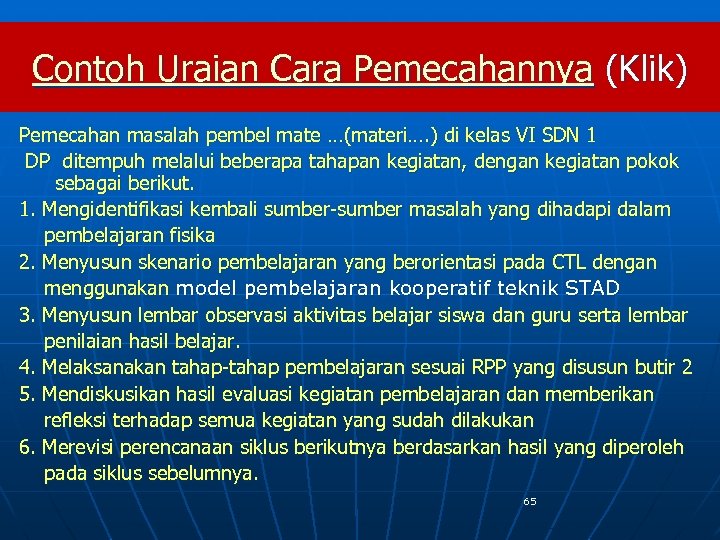 Contoh Uraian Cara Pemecahannya (Klik) Pemecahan masalah pembel mate …(materi…. ) di kelas VI SDN 1 DP ditempuh melalui beberapa tahapan kegiatan, dengan kegiatan pokok sebagai berikut. 1. Mengidentifikasi kembali sumber-sumber masalah yang dihadapi dalam pembelajaran fisika 2. Menyusun skenario pembelajaran yang berorientasi pada CTL dengan menggunakan model pembelajaran kooperatif teknik STAD 3. Menyusun lembar observasi aktivitas belajar siswa dan guru serta lembar penilaian hasil belajar. 4. Melaksanakan tahap-tahap pembelajaran sesuai RPP yang disusun butir 2 5. Mendiskusikan hasil evaluasi kegiatan pembelajaran dan memberikan refleksi terhadap semua kegiatan yang sudah dilakukan 6. Merevisi perencanaan siklus berikutnya berdasarkan hasil yang diperoleh pada siklus sebelumnya. 65