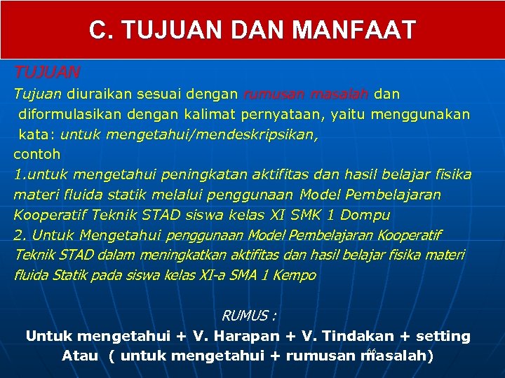 C. TUJUAN DAN MANFAAT TUJUAN Tujuan diuraikan sesuai dengan rumusan masalah dan diformulasikan dengan kalimat pernyataan, yaitu menggunakan kata: untuk mengetahui/mendeskripsikan, contoh 1. untuk mengetahui peningkatan aktifitas dan hasil belajar fisika materi fluida statik melalui penggunaan Model Pembelajaran Kooperatif Teknik STAD siswa kelas XI SMK 1 Dompu 2. Untuk Mengetahui penggunaan Model Pembelajaran Kooperatif Teknik STAD dalam meningkatkan aktifitas dan hasil belajar fisika materi fluida Statik pada siswa kelas XI-a SMA 1 Kempo RUMUS : Untuk mengetahui + V. Harapan + V. Tindakan + setting 66 Atau ( untuk mengetahui + rumusan masalah)