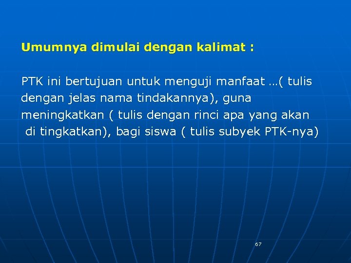 Umumnya dimulai dengan kalimat : PTK ini bertujuan untuk menguji manfaat …( tulis dengan jelas nama tindakannya), guna meningkatkan ( tulis dengan rinci apa yang akan di tingkatkan), bagi siswa ( tulis subyek PTK-nya) 67