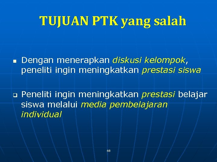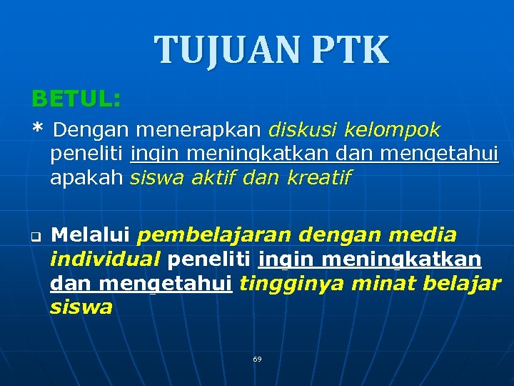 TUJUAN PTK yang salah n q Dengan menerapkan diskusi kelompok, peneliti ingin meningkatkan prestasi siswa Peneliti ingin meningkatkan prestasi belajar siswa melalui media pembelajaran individual 68