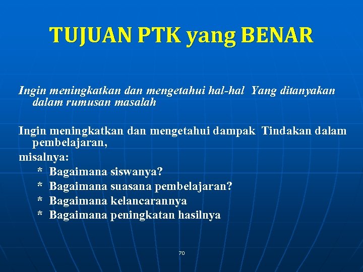 TUJUAN PTK yang BENAR Ingin meningkatkan dan mengetahui hal-hal Yang ditanyakan dalam rumusan masalah Ingin meningkatkan dan mengetahui dampak Tindakan dalam pembelajaran, misalnya: * Bagaimana siswanya? * Bagaimana suasana pembelajaran? * Bagaimana kelancarannya * Bagaimana peningkatan hasilnya 70