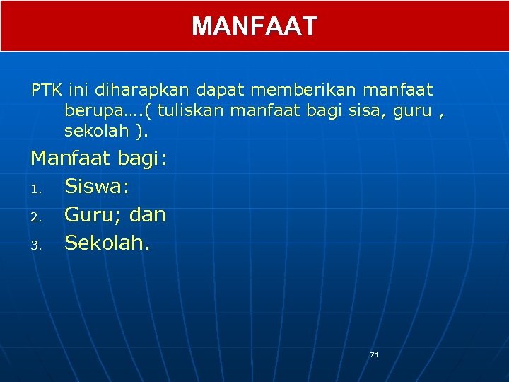 MANFAAT PTK ini diharapkan dapat memberikan manfaat berupa…. ( tuliskan manfaat bagi sisa, guru , sekolah ). Manfaat bagi: 1. Siswa: 2. Guru; dan 3. Sekolah. 71