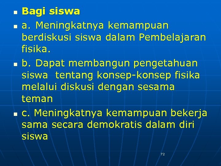 n n Bagi siswa a. Meningkatnya kemampuan berdiskusi siswa dalam Pembelajaran fisika. b. Dapat membangun pengetahuan siswa tentang konsep-konsep fisika melalui diskusi dengan sesama teman c. Meningkatnya kemampuan bekerja sama secara demokratis dalam diri siswa 72